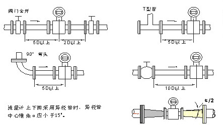 直管段長度為了保證電磁流量計(jì)的測量準(zhǔn)確度和穩(wěn)定性,流量計(jì)安裝位置上下游應(yīng)滿足下圖所示的管路條件。