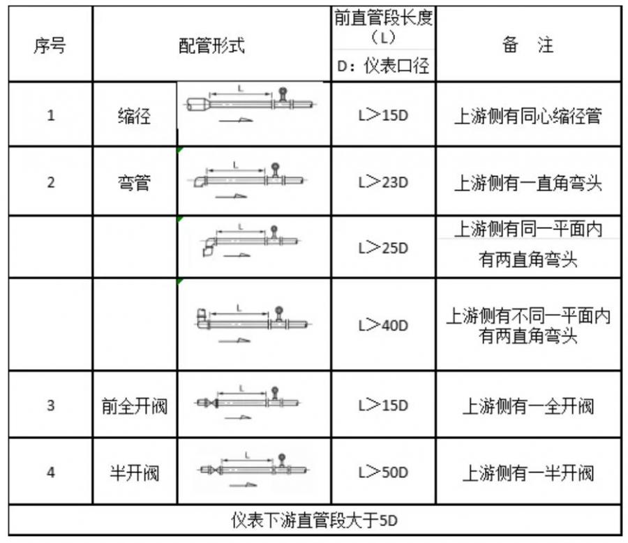 2.渦街流量計(jì)的上游側(cè)和下游側(cè)應(yīng)有較長的直管段。其上、下游直管段長度根據(jù)管道狀況不同而不同,直管段的具體安裝長度和要求見下表。
