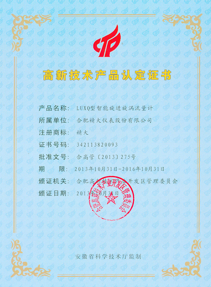 省高新技術(shù)產(chǎn)品認(rèn)定證書(LUXQ型旋進(jìn)漩渦)